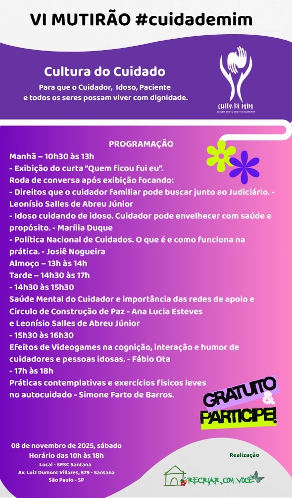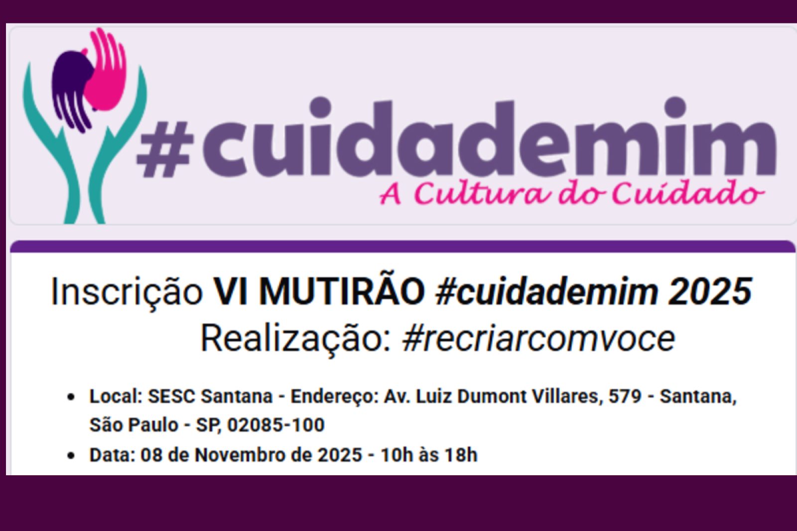 Em 2025 será feita a 6ª edição Mutirão# Cuida de Mim, desta vez no SESC Santana, na Avenida Dumont Villares, 579, no bairro de Santana, das 10 às 18 horas.