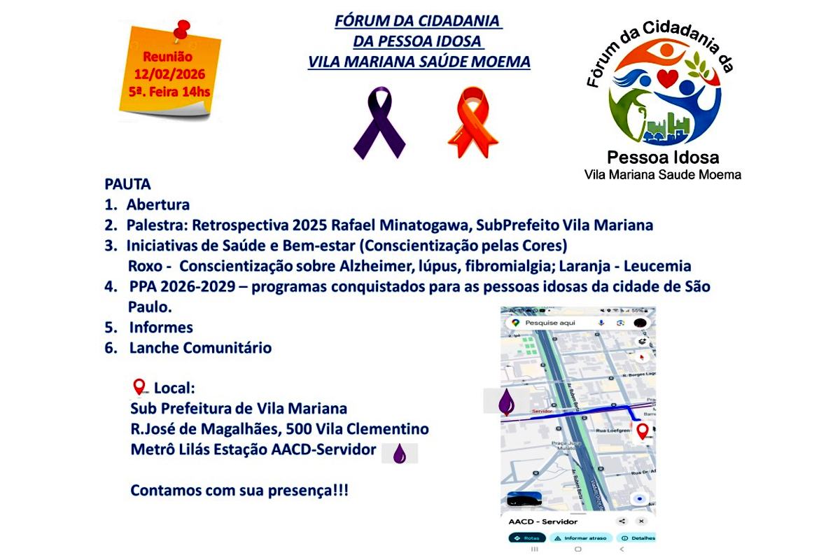 Fórum da Cidadania da Pessoa Idosa da Vila Mariana, Saúde e Moema, na Zona Sul da Capital, em SP, faz na quinta-feira, 12 de fevereiro, de 14 às 16 horas, a sua primeira reunião mensal de 2026, desta vez na sede da Subprefeitura da Vila Mariana.