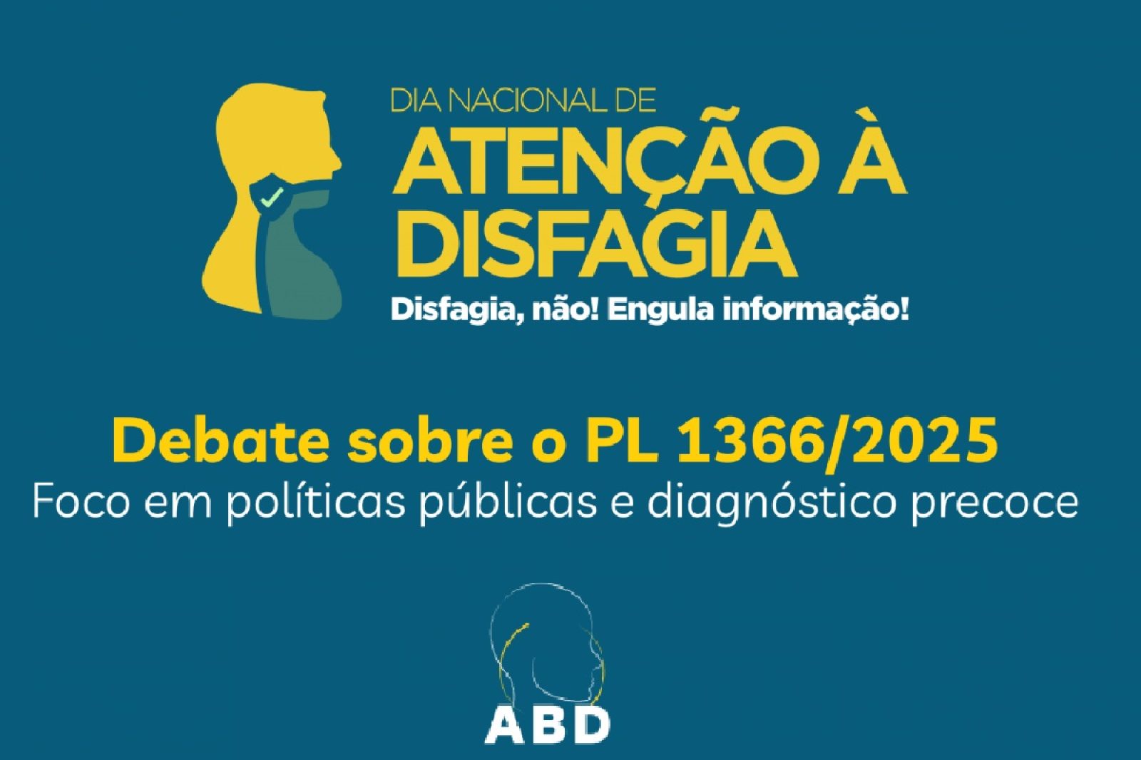 A Academia Brasileira de Disfagia promoverá um debate institucional na Assembleia Legislativa do Estado de São Paulo, sobre as questões que envolvem a doença. O evento está marcado para o dia 17 de março, das 10h às 13h, no auditório Franco Montoro,  na Avenida Pedro Álvares Cabral, 201, no Ibirapuera.