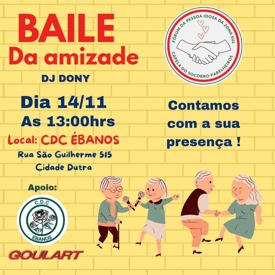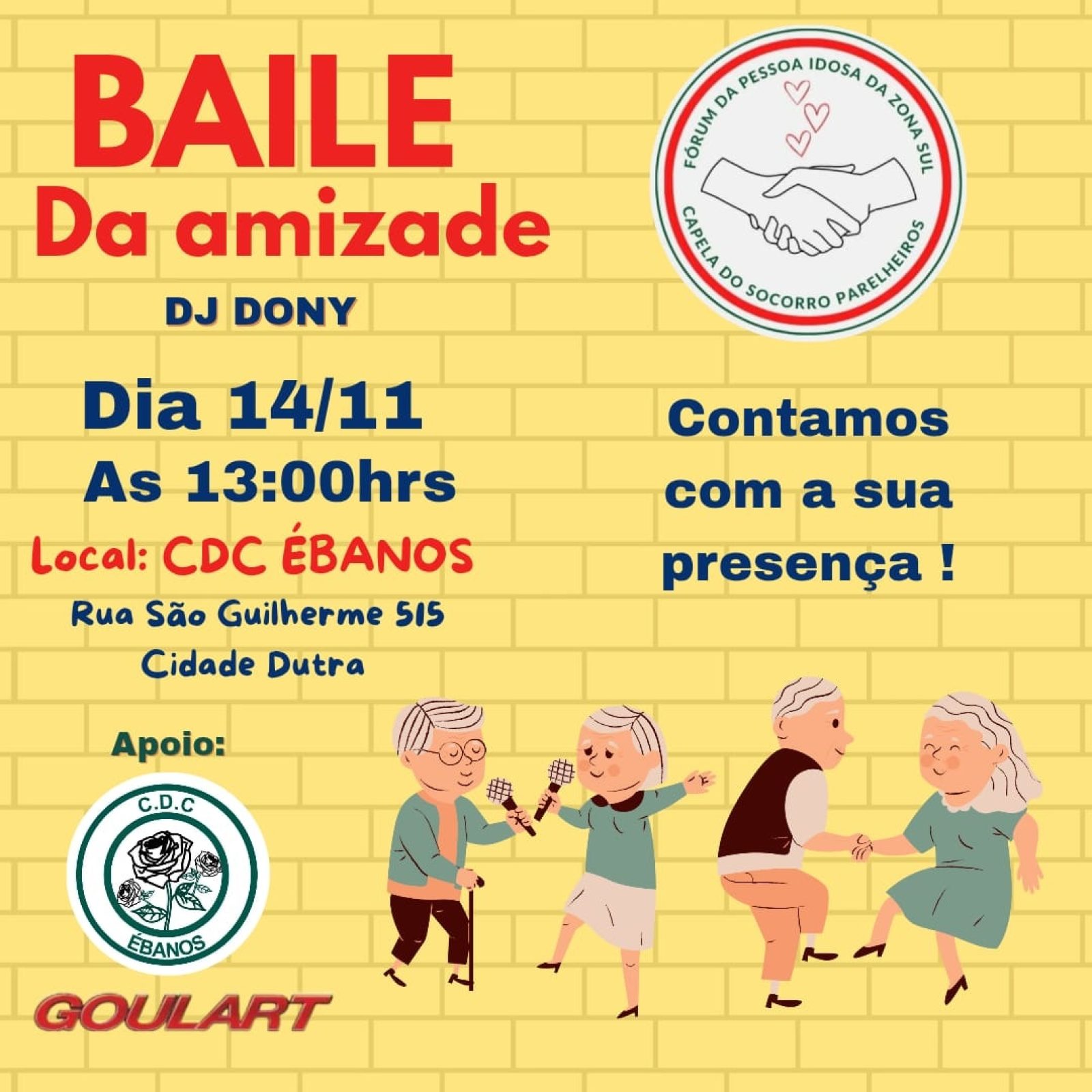O Fórum do Cidadão Idoso da Capela do Socorro e Parelheiros, na Zona Sul da Capital, em São Paulo, faz o seu baile mensal, dia 13 de novembro, desta vez com o tema da Amizade, às 13 horas, aberto, grátis.
