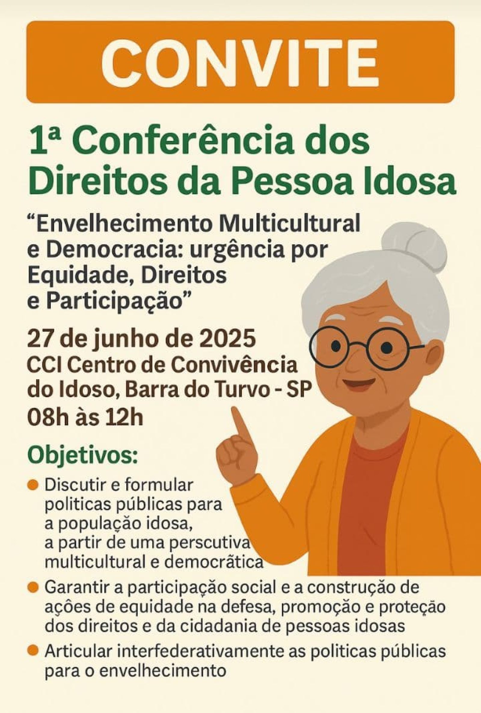 Barra do Turvo, distante 335 km da capital em SP, faz em 27/6 a 1ª Conferência dos Direitos da Pessoa Idosa Agenda Municípios SP Registro e Regiões 26 de junho de 2025 Herminia Brandão 26 de junho de 2025