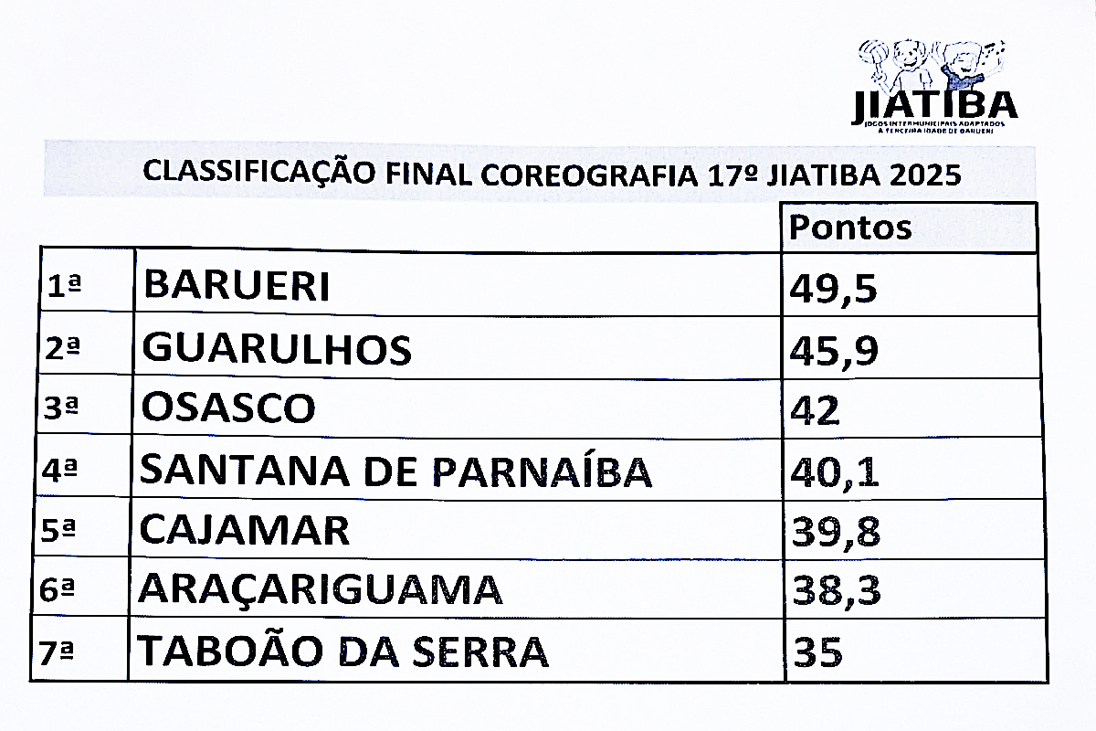 As equipes de Barueri, Guarulhos e Osasco foram as vencedoras da Coreografia logo após a cerimônia de abertura dos 17º Jogos Intermunicipais Adaptados à Terceira Idade de Barueri, que tiveram início ontem, 10 de setembro, no Parque da Maturidade José Dias da Silva,