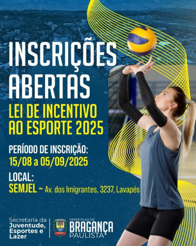 A Prefeitura de Bragança Paulista, por meio da Secretaria Municipal da Juventude, Esporte e Lazer (SEMJEL) e da Comissão de Análise de Projetos, informa que estão abertas as inscrições para os interessados em receber recursos da Lei Municipal de Incentivo ao Esporte 2025.