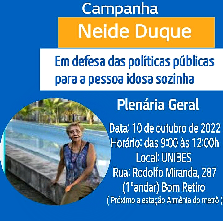 Os organizadores da Campanha Neide Duque – Em defesa das políticas públicas para a pessoa idosa sozinha realizam hoje, 10/10, uma reunião plenária, na sede da UNIBES, no bairro do Bom Retiro, no Centro de São Paulo.