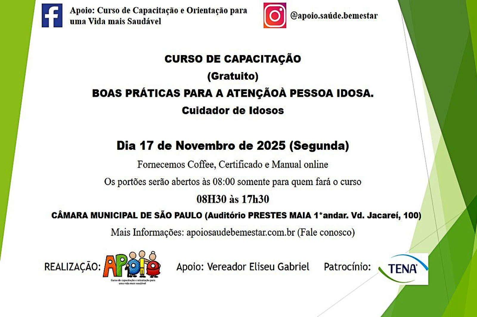 A empresa Apoio-Cursos de Capacitação e Orientação para uma vida Saudável, que realiza cursos abertos gratuitos, na Câmara Municipal de São Paulo, marcou  um novo (o último do ano) para o dia 17 de novembro, das 8h30 às 16h30, no auditório Prestes Maia.