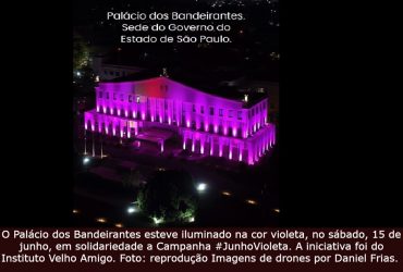 O Palácio dos Bandeirantes esteve iluminado no sábado 15 de junho com as cores da campanha JunhoVioleta