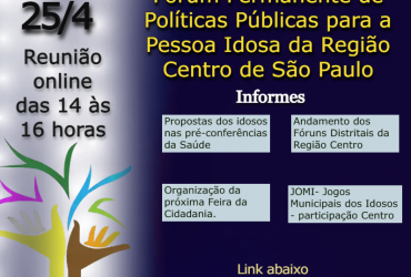Fórum para Pessoas Idosas da Região Centro, da Capital, SP, faz a sua reunião mensal, desta vez virtual em 25/4