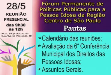 Fórum para Pessoas Idosas da Região Centro, na capital SP, faz hoje, 28/5 reunião presencial na Subprefeitura Sé
