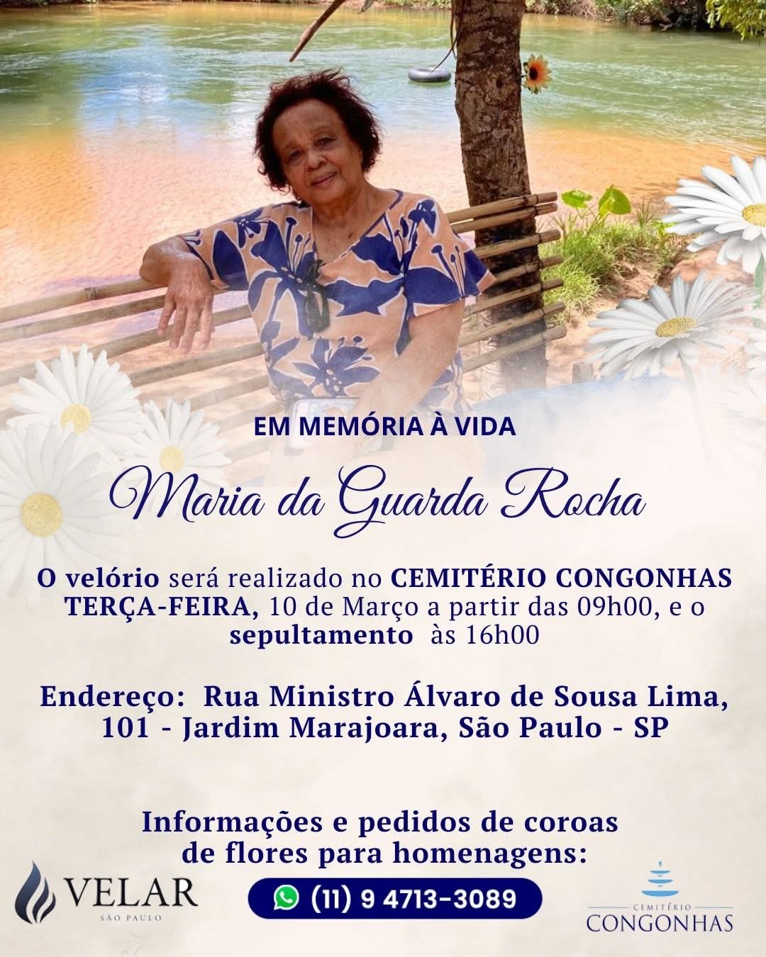 É com pesar que o Jornal da 3ª Idade registra o falecimento de Maria da Guarda Rocha, tratada por todos como Rochinha.