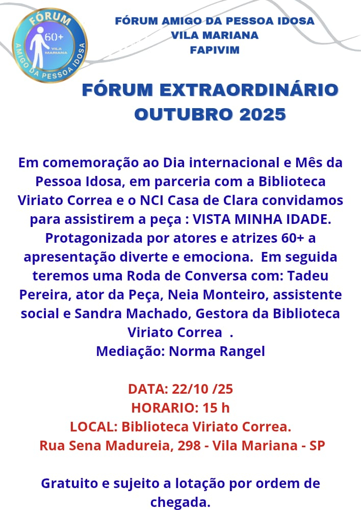 Fórum Amigo da Pessoa Idosa Vila Mariana faz reunião em 22 de outubro com apresentação de teatro AGENDA CAPITAL SP Vila Mariana e Região 20 de outubro de 2025 Siga o Jornal da 3ª Idade de SP no Instagram Herminia Brandão 20 de outubro de 2025