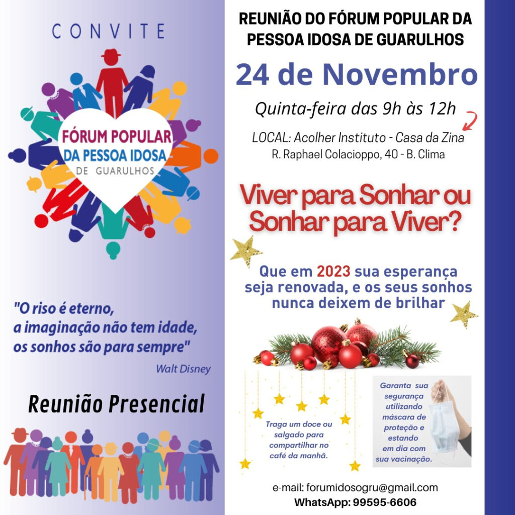 Fórum da Pessoa Idosa de Guarulhos faz última reunião do ano em 24/11 Agenda Municípios SP Grande SP 12 de novembro de 2022 O Fórum Popular da Pessoa Idosa de Guarulhos, na segunda maior cidade da Grande São Paulo, marcou para a quinta-feira, 24 de novembro, o último encontro mensal de 2022, das 9 às 12 horas, no Teatro Adamastor, na Rua Monteiro Lobato nº 734.
