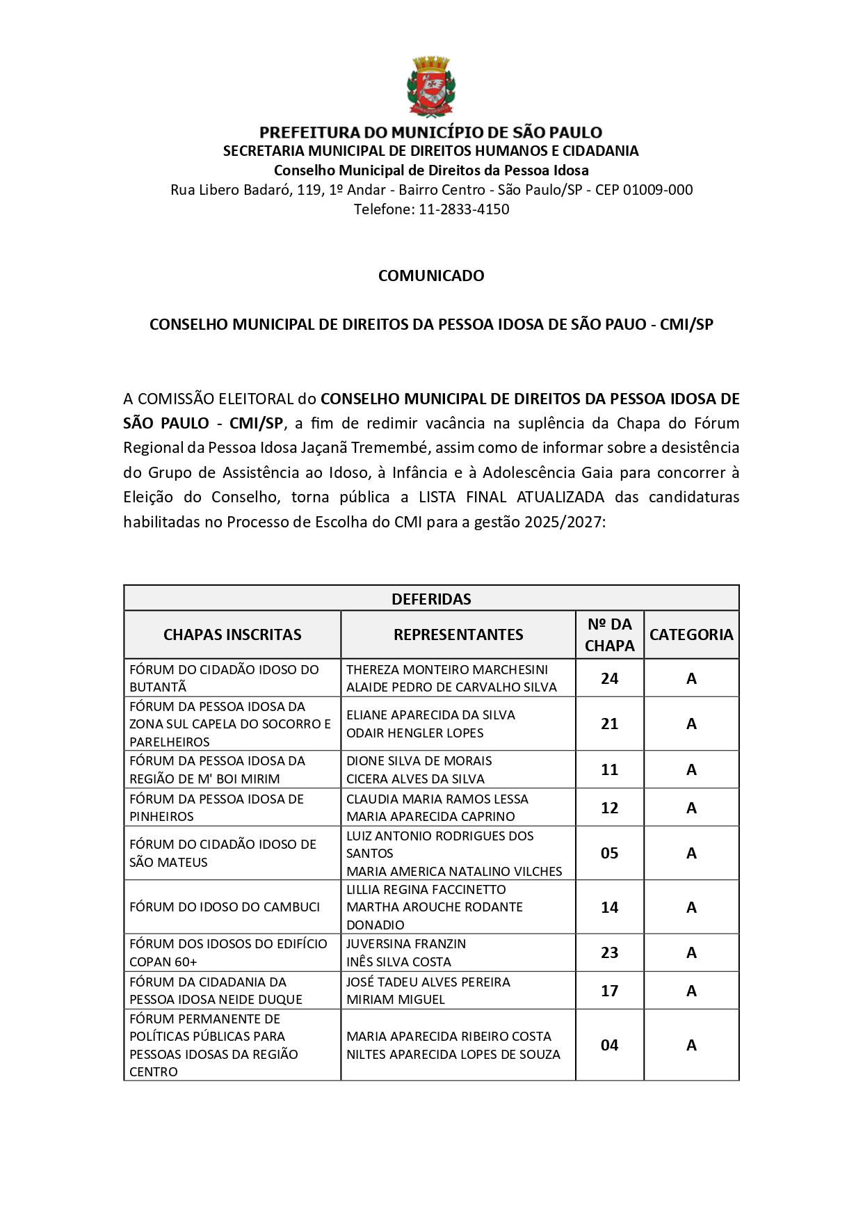 Hoje, sábado dia 29 de novembro, é a eleição dos novos conselheiros do Conselho Municipal dos Direitos da Pessoa Idosa de São Paulo, das 9 às 17 horas, nos postos do Descomplica SP, que ficam nas Subprefeituras. Os conselheiros da sociedade civil serão eleitos para o biênio 2025-2027.