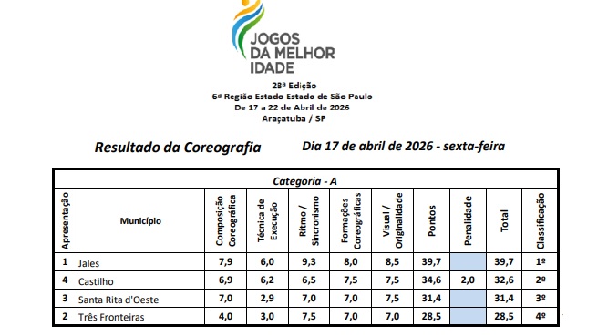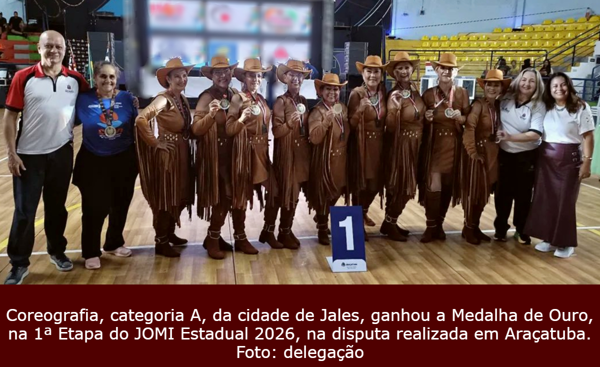 A coreografia “Liberdade na Bota”, embalada pela música “Chattahoochee”, do compositor norteamericano Alan Jackson, criada e ensaiada pela professora Silvia Lourenção dos Reis, da cidade de Jales, ficou com a medalha de ouro na Categoria A, na abertura da 1ª Etapa do JOMI 2026. A disputa da modalidade aconteceu na sexta-feira 17 de abril, em Araçatuba.