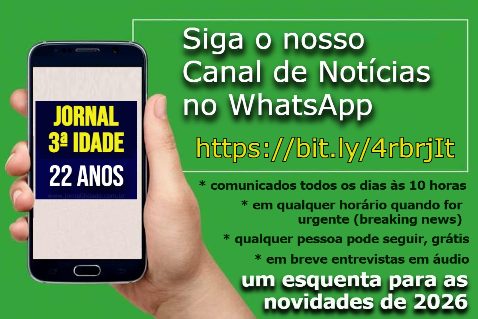 Canal do Jornal da 3ª Idade no WhatsApp com notícias, entrevistas em aúdio, antecipando novidades de 2026 AGENDA CAPITAL SP EXTRA 21 de novembro de 2025 Canal de Notícias no WhatsApp https://www.whatsapp.com/channel/0029Vb6oD6d65yDEtxwgn22N Jornal da 3ª Idade no Instagram https://www.instagram.com/jornaldaterceiraidade/ Jornal da 3 Idade no Telegram t.me/Jornal3idadesp Herminia Brandão 21 de novembro de 2025