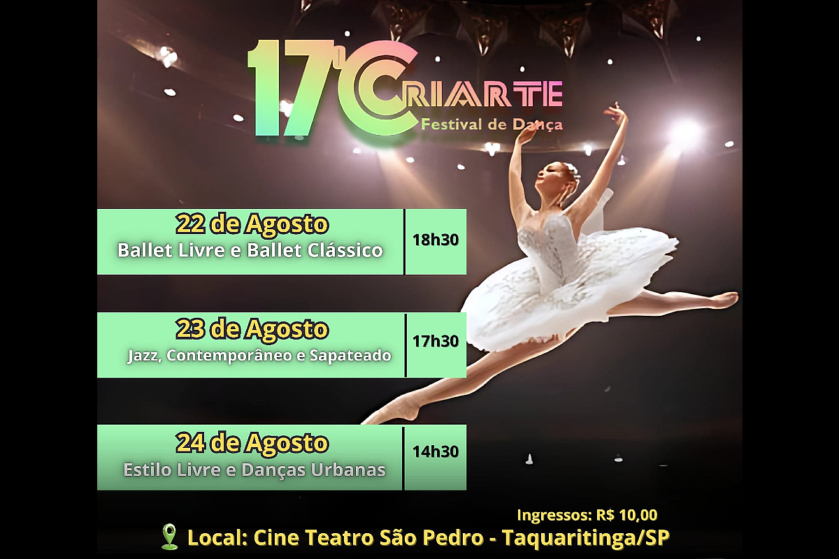 A cidade de Taquaritinga, distante cerca 340 km da capital, em São Paulo, promove a partir da próxima sexta-feira e até o domingo 24, no seu Centro Cultural São Pedro, o 17º CRIARTE Festival de Dança.