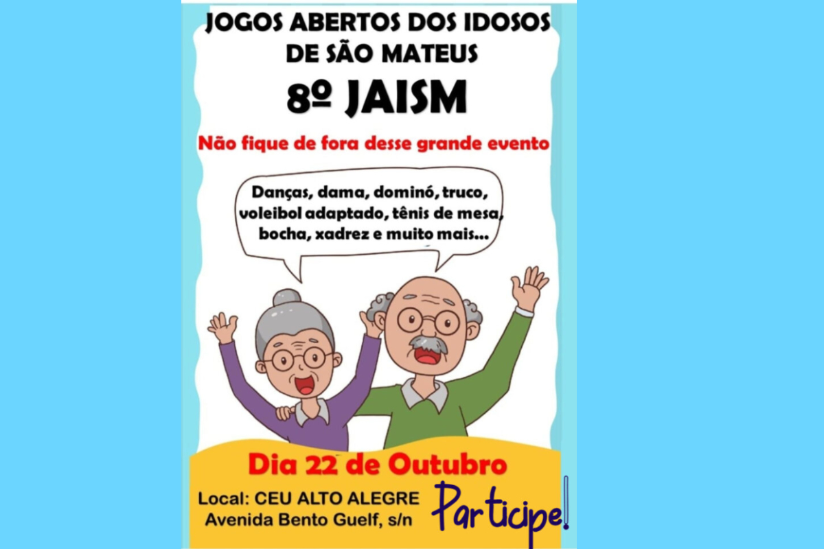 O 8º JAISM – Jogos Abertos dos Idosos de São Mateus está marcado para o próximo sábado, 22 de outubro de 2022, das 8 às 17 horas, no CEU Alto Alegre, na Av. Bento Guelfi, s/n – Jardim Alto Alegre, na Zona Leste da Capital, em São Paulo.