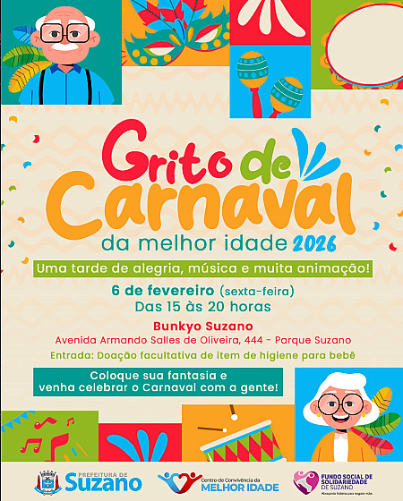 O Centro de Convivência da Melhor Idade Maria Picoletti realiza na próxima sexta-feira, 6 de fevereiro, o “Grito de Carnaval da Melhor Idade”, evento grátis aberto ao público. entrada será solidária, com doação facultativa de item de higiene para bebê, que será destinada ao Fundo Social de Solidariedade de Suzano.