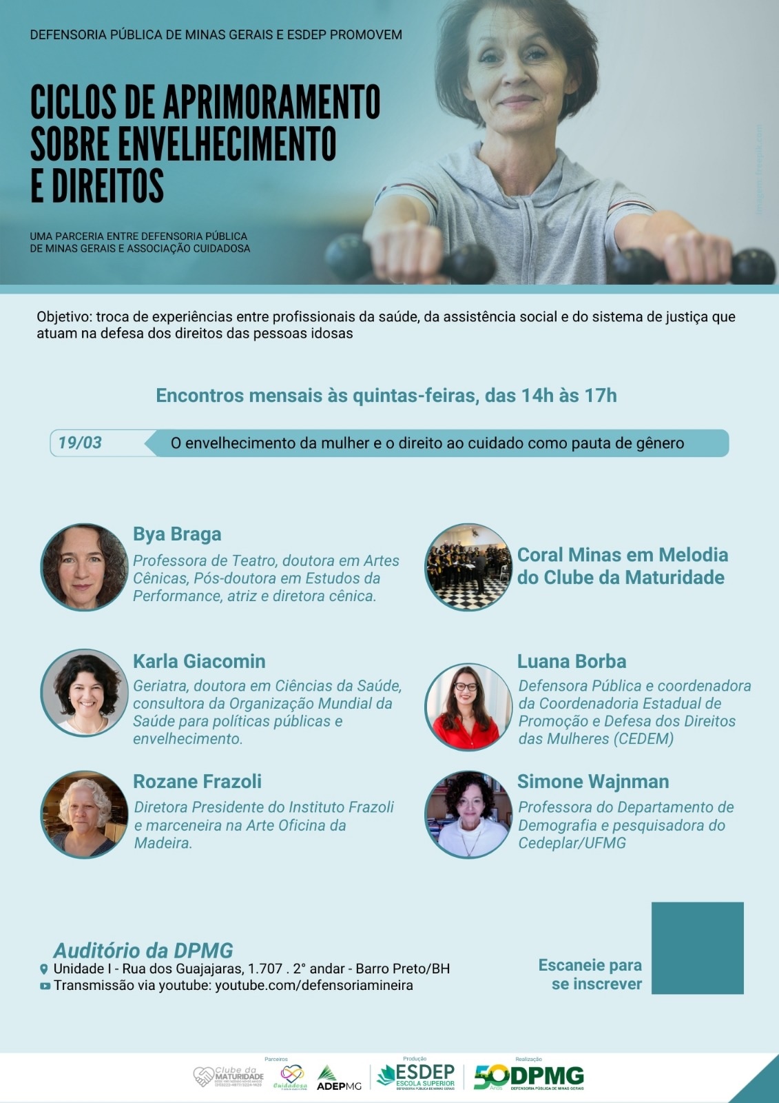 “O envelhecimento da mulher e o direito ao cuidado como pauta de gênero” é o tema do 2º Ciclo de Aprimoramento sobre Envelhecimento e Direitos, organizado pela Defensoria Pública de Minas Gerais e a Associação Cuidadosa. O evento será na próxima quinta-feira, 19 de março, das 14 às 17 horas, no auditório da DPMG, em Belo Horizonte, com transmissão ao vivo pelo YouTube