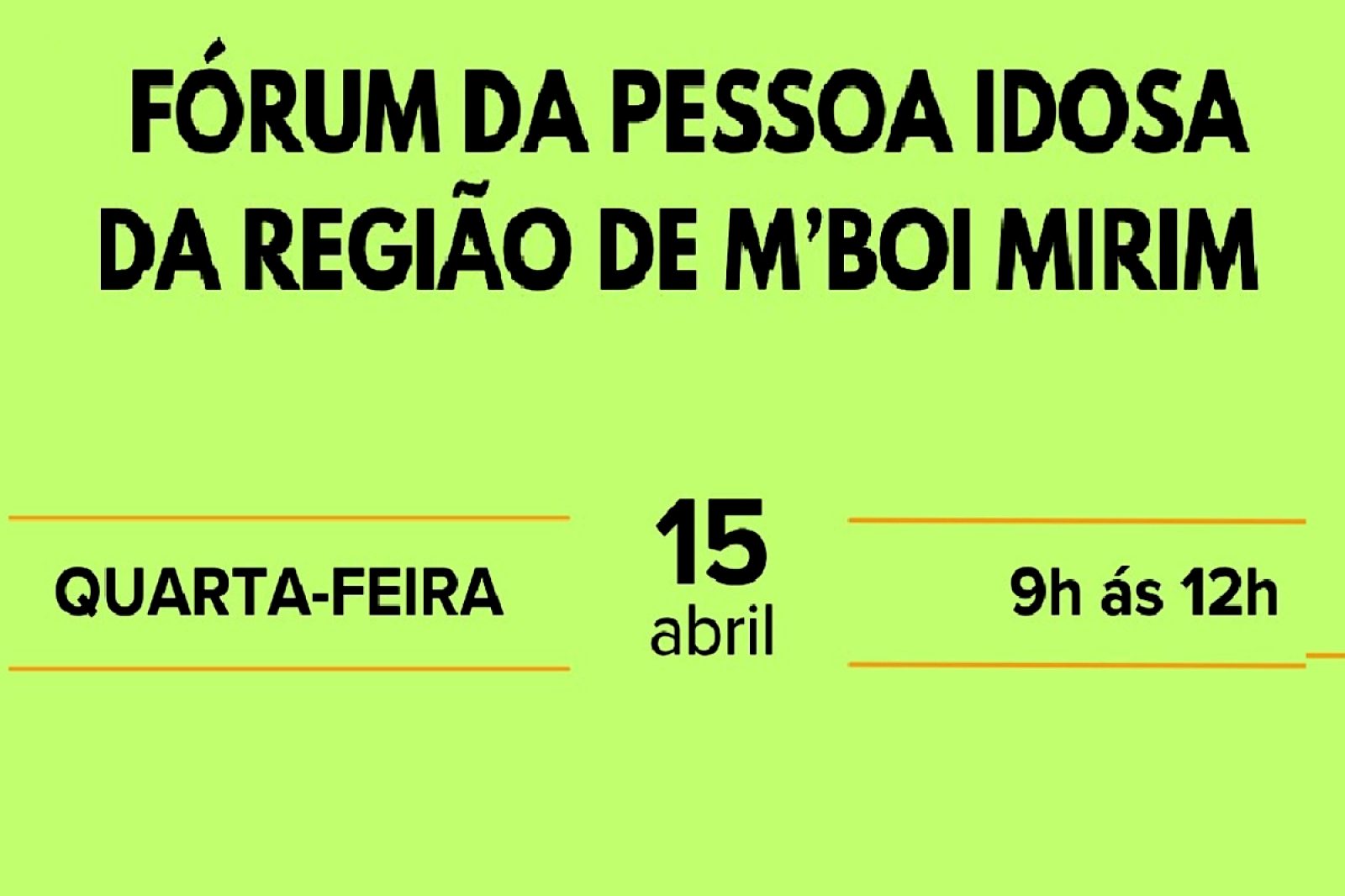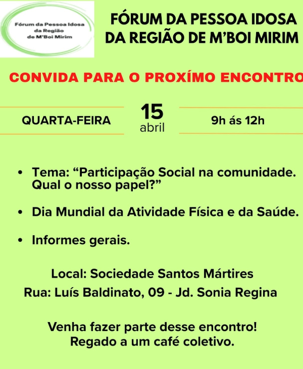 O Fórum da Pessoa Idosa da Região do M’Boi Mirim, na Zona Sul da Capital, em São Paulo, faz na quarta-feira, dia 15,  sua reunião de abril de 2026, das 9 às 12 horas, na Sociedade Santos Mártires, na Rua Luís Baldinato, nº9, no Jardim Sônia Regina.