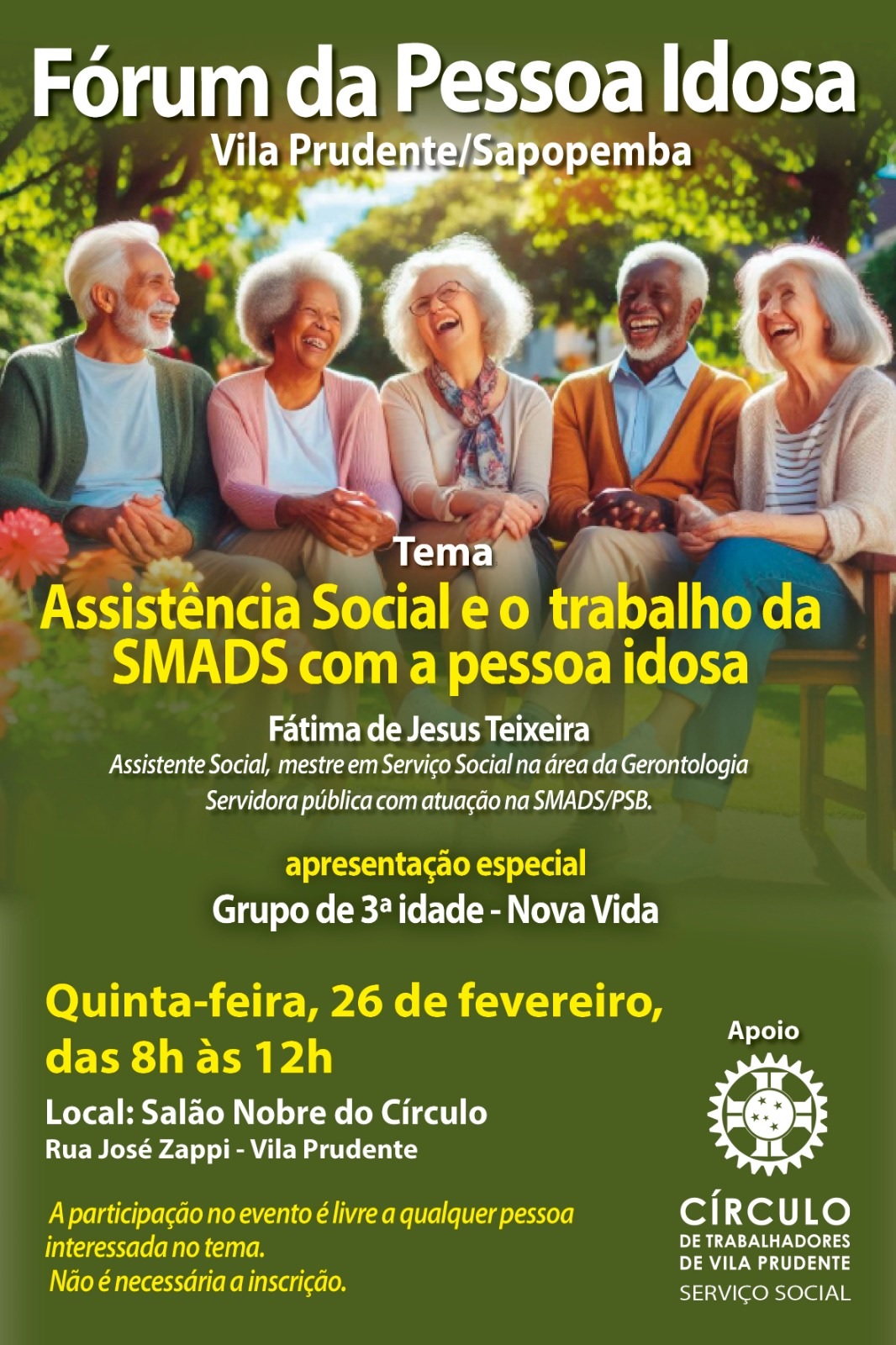 O Fórum da Pessoa Idosa de Vila Prudente e Sapopemba faz a sua primeira reunião de 2026, na quinta-feira, 26 de fevereiro. O encontro será realizado nas dependências do Círculo dos Trabalhadores da Vila Prudente, na Rua José Zappi,120, na Vila Prudente, das 8 às 12 horas.