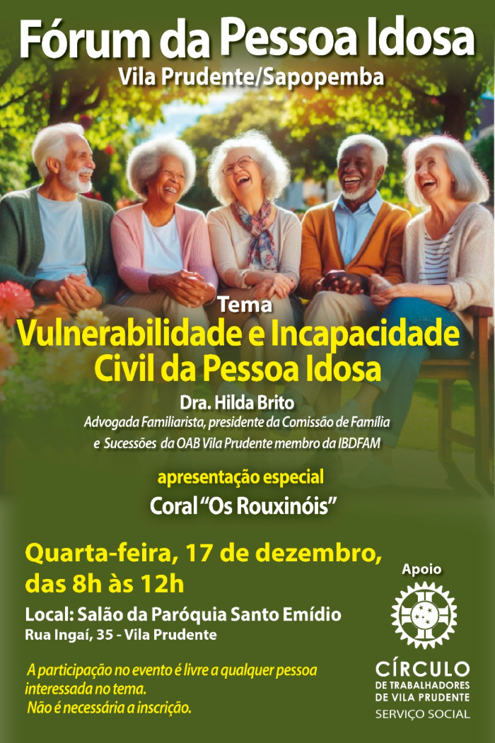 O Fórum da Pessoa Idosa de Vila Prudente e Sapopemba faz sua reunião de dezembro de 2025, na quarta-feira, dia 17. O encontro será realizado nas dependências do Círculo dos Trabalhadores da Vila Prudente, na Rua José Zappi,120, na Vila Prudente.