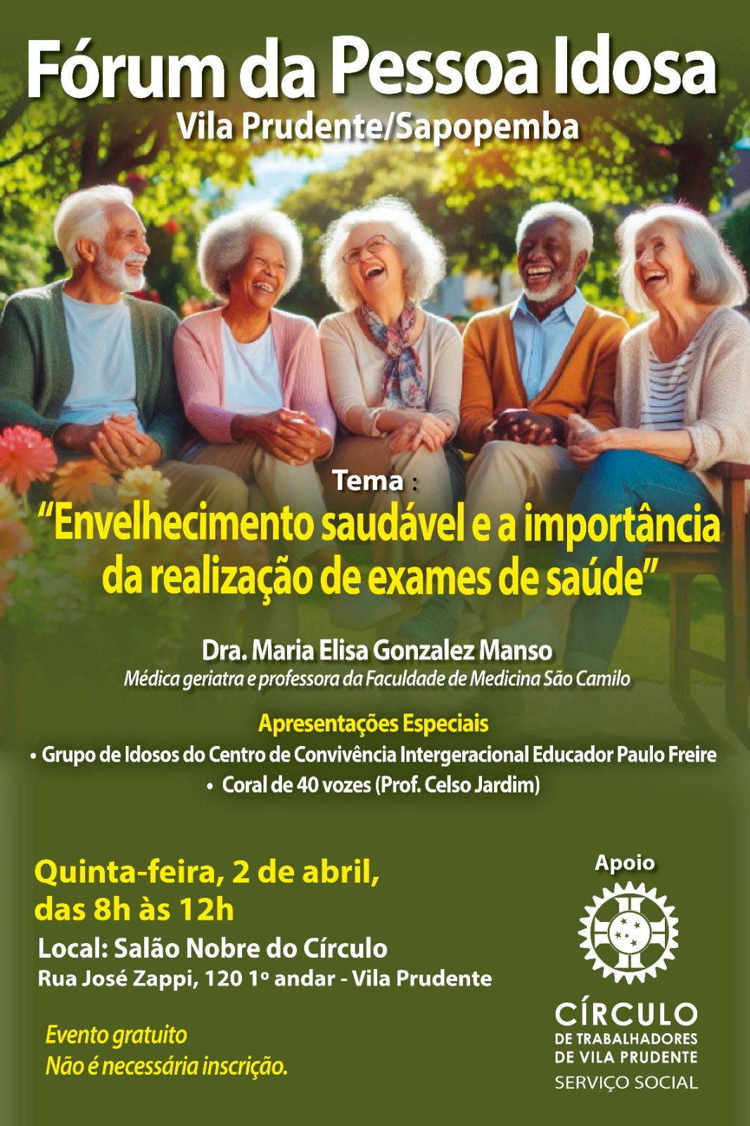 O Fórum da Pessoa Idosa de Vila Prudente e Sapopemba marcou a sua próxima reunião para a quinta-feira, 2 de abril de 2026. O encontro será realizado nas dependências do Círculo dos Trabalhadores da Vila Prudente, na Rua José Zappi,120, na Vila Prudente, das 8 às 12 horas.