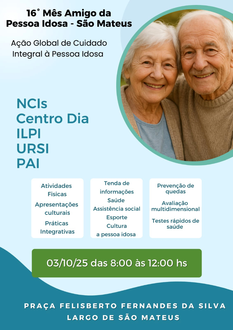 O Fórum do Cidadão Idoso de São Mateus, na Zona leste de São Paulo, faz a sua comemoração do 16º Amigo da Pessoa Idosa, em 2025, em dois dias pontuais. Em 1º de outubro, Dia Internacional da Pessoa Idosa propondo ações em todas as 23 UBS do território. Na sexta-feira seguinte, dia 3, uma “Ação Global de Cuidado Integrado a Pessoa Idosa”, na Praça Felisberto Fernandes da Silva, o Largo de São Mateus.