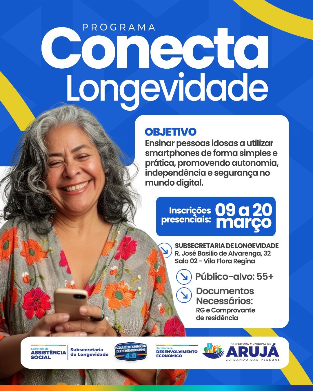 Prefeitura de Arujá, na Grande SP, está com inscrições abertas para curso de utilização do celular de 9 a 20/3 Agenda Municípios SP 9 de março de 2026 Siga o Jornal da 3ª Idade de SP no Instagram Herminia Brandão 9 de março de 2026