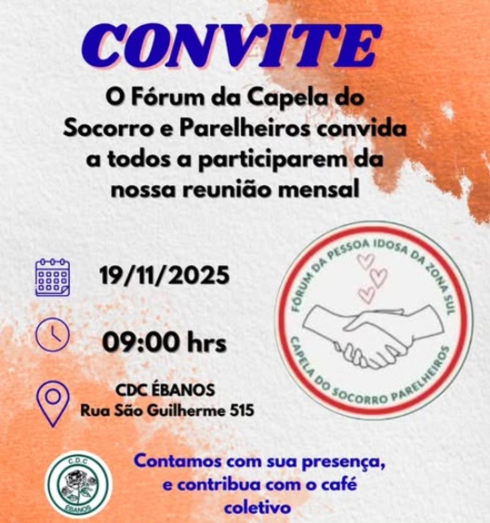 O Fórum da Pessoa Idosa da Capela do Socorro e Parelheiros, na Zona Sul da Capital, em São Paulo, fará na quarta-feira, dia 19, a sua reunião de novembro de 2025, das 9 horas às 12 horas, no Clube Desportivo Municipal Ébanos, na Rua São Guilherme, 515, no bairro Cidade Dutra.