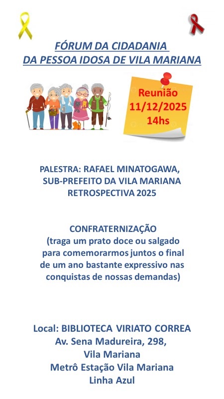 Reunião do Fórum da Cidadania da Pessoa Idosa da Vila Mariana, da Zona Sul em SP, de dezembro será dia 11 AGENDA CAPITAL SP EXTRA Vila Maria e REG. 8 de dezembro de 2025 Siga o Jornal da 3ª Idade de SP no Instagram Herminia Brandão 8 de dezembro de 2025