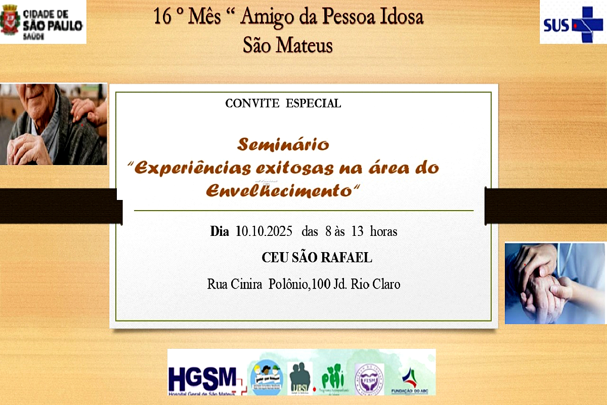 O seminário “Experiências Exitosas na Área do Envelhecimento”, promovido pelo Fórum do Cidadão Idoso de São Mateus, será na próxima sexta-feira, 10 de outubro,no CEU São Rafael, na Rua Cinira Polônio, 100, no bairro Conjunto Promorar Rio Claro, das 8h às 13 horas.